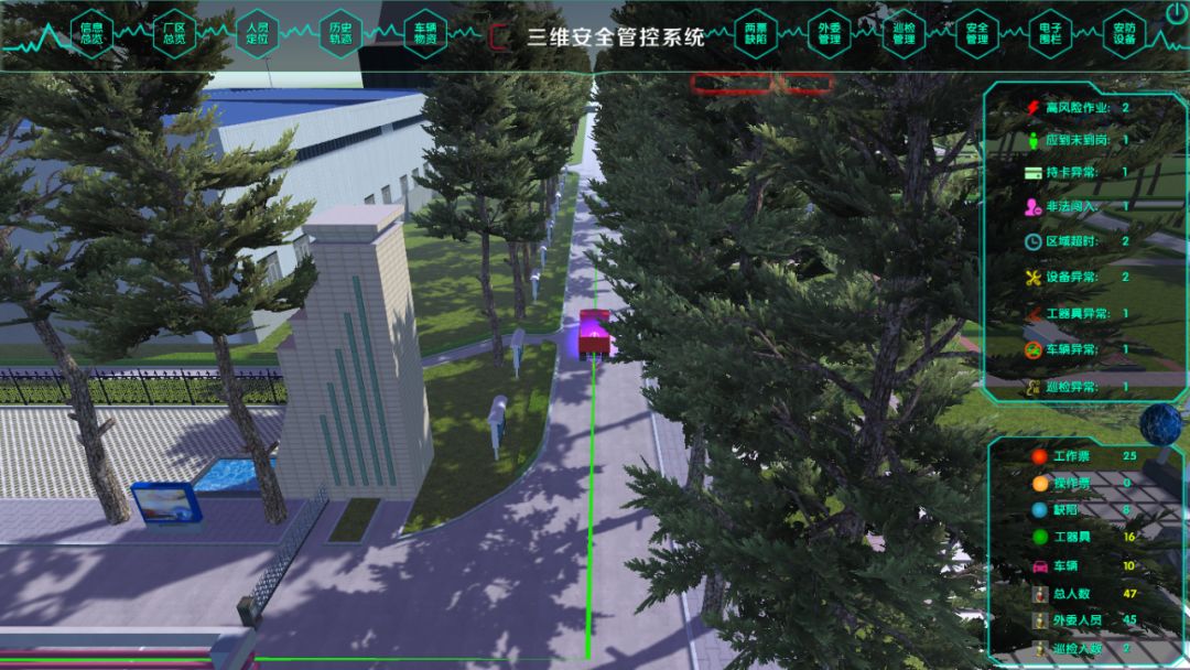 進出廠區的運送固廢車輛,?;奋囕v、外來車輛、重型機械等安裝GPS定位。在系統中為車輛預設固定路線,并通過GPS進行追蹤,實現各類車輛的實時位置監督、跟蹤其行駛軌跡,一旦發現偏離預設路線立即報警并推送相關管理人員。